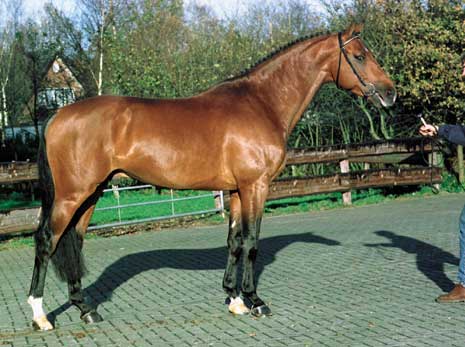 Honest and reliable stallion. He is more than sufficiently willing to work and he works more than sufficiently. The walk is sufficient in scope but a little stiff. The trot has sufficient scope but it should have more power and regularity. The canter has more power and balance. He has sufficient talent for dressage and gives his rider a sufficient feeling. He has more than sufficient take-off. He has good foreleg technique. He bascules well and finishes the jump more than sufficiently. He seems careful and shows much scope. He has much talent for jumping and gives his rider a good feeling.