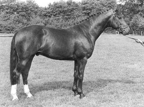Offspring 1983 (foals)This stallion showed a collection of very well developed foals with strong rumps. The foals appear to be good riding type, the selected foals more so. In general they are the picture of breeding horses. The foals out of mares with thoroughbred blood are a little more refined. The head is well formed, hard and lean, sometimes a little long. The neck has a good topline and also has good shape and shows a nice, long poll. The wither has sufficient length but is not totally developed. The shoulder length and placement are good with a good connection to the rump. The back is sometimes a bit long but otherwise shows good connections; the loins are also well connected. The croup is long, wide and muscled with a long hamstring. The picked foals could have a wider croup. The build and stance of the foreleg are good with a developed knee. The hindleg is often a little long and cow hocked. The hock could be finished more tightly. The quality of the legs could be a little more appealing in general, meaning they could be a little leaner. The walk is more than good, easy and scopey with a hindquarter than comes underneath well. The trot is very good with a hindquarter that comes underneath well and a lot of balance.