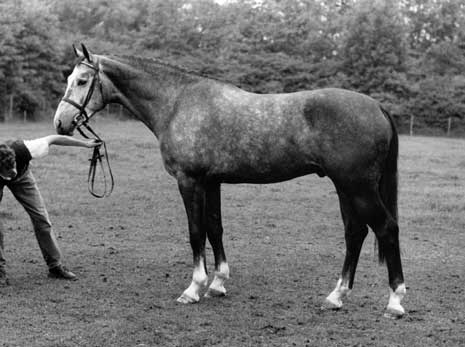 Offspring 1989The foals of this stallion are well developed with good rumps. The group was pretty uniform and showed sufficient riding type foals. The head is well formed; the poll is well placed and has good length and muscling. The wither is well developed in a number of foals and is also sufficiently long. Other foals should have more length and development in the wither. The same is true for the shoulder, which generally has sufficient length and also the desired slope, but several foals had a rather straight shoulder and it should also be longer. The back is generally well muscled but sometimes a little long when the shoulder is not ideal. The loins are well muscled and connected. The croup has good form and length, a few are a little straight. The foreleg is correct with a good cannon and knee. The hindleg varies - sometimes it is correct, sometimes it is long and sometimes a little straight. The quality of the legs is good. The walk is good with sufficient power and scope. The foals show good movement in the trot with a hindleg that comes underneath well. The foals trot easily. On the basis of the collection of foals shown, often accompanied by simple mares, it may be said that the stallion can handle a mare with a lot of thoroughbred blood.