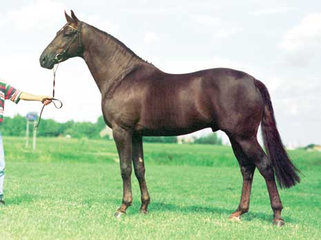 Offspring 1994 (foals)This stallion showed a uniform collection of generously developed, long-lined foals. They are riding type and have sufficient refinement. The head is long but does have a lot of expression. The neck has good length but it sometimes a little forward and it should be rounder in the topline. The selected foals have a good topline. The neck is carried well. The wither is sufficient in length and development. Length and placement of the shoulder are good. The back is good. The loins have good muscling and are well connected. The croup should have more length and slope. The selected foals have a better croup. The buttock is muscled well and the gaskin is sufficient. The stance of the foreleg is good. The hindleg is long and often sickle-hocked. The base is well developed.