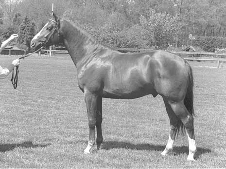 Offspring 1994 (foals)This stallion showed barely sufficient to sufficiently developed foals. The selected foals were a little better developed. The collection seemed to have good riding type, while refinement and appeal were also on hand. The head is pretty and has an expressive eye. The neck is generally well formed, has the required length and possesses a nice rounding in the topline. The transition from neck to the wither/shoulder formation should be smoother. The wither is especially well developed and also has good length. There is no doubt that the length and placement of the shoulder are good. Back and loin are well formed and muscled. The croup is good, has sufficient length but is sometimes a bit round. The selected foals had good croups. The foreleg is often tied in under the knee, often a bit poor and sometimes hollow (picked foals) or tight). They pretty much all have long pasterns. The hindleg is correct, sometimes long and could often have more substance.