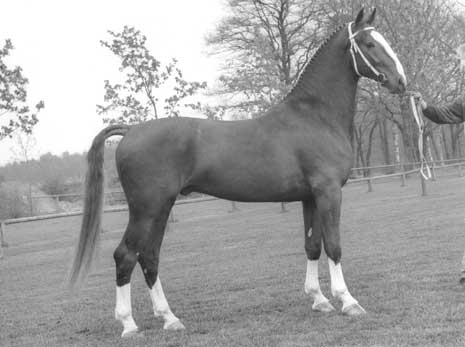 Offspring 1997 (foals)This stallion showed a uniform collection of well-developed foals. They are in good tuig type and clearly in rectangular model. The foals have front, refinement and charm. The foals trot with a good front, a lot of suspension and a noticeable good use of the hindleg. The head varies a little, from a little convex to very pretty. The foals have more than sufficient poll. The neck is a little heavy but has good length and nice muscling through the topline and is carried well. The wither is sufficiently to well developed. The shoulder has sufficient length and good position. Even though it is a little weak, the back is well formed and muscled. The loins are well connected. The croup has good form and placement and sufficient muscling. The hamstring is long. The stance of the foreleg varies, from back at the knee to straight. The foreleg has sufficient length. The hindleg generally has a small angle. The base is hard and dry, with correctly formed joints.