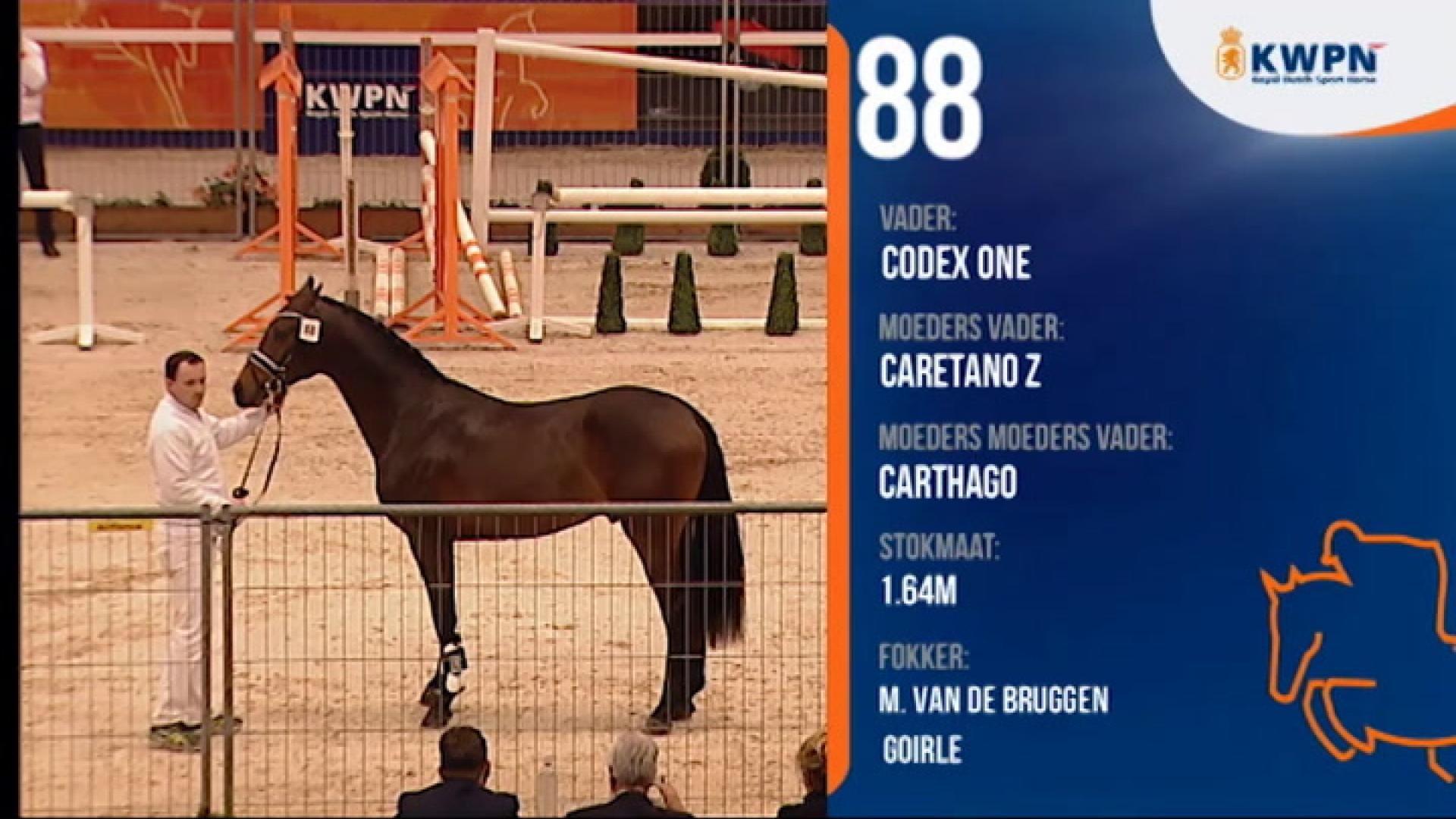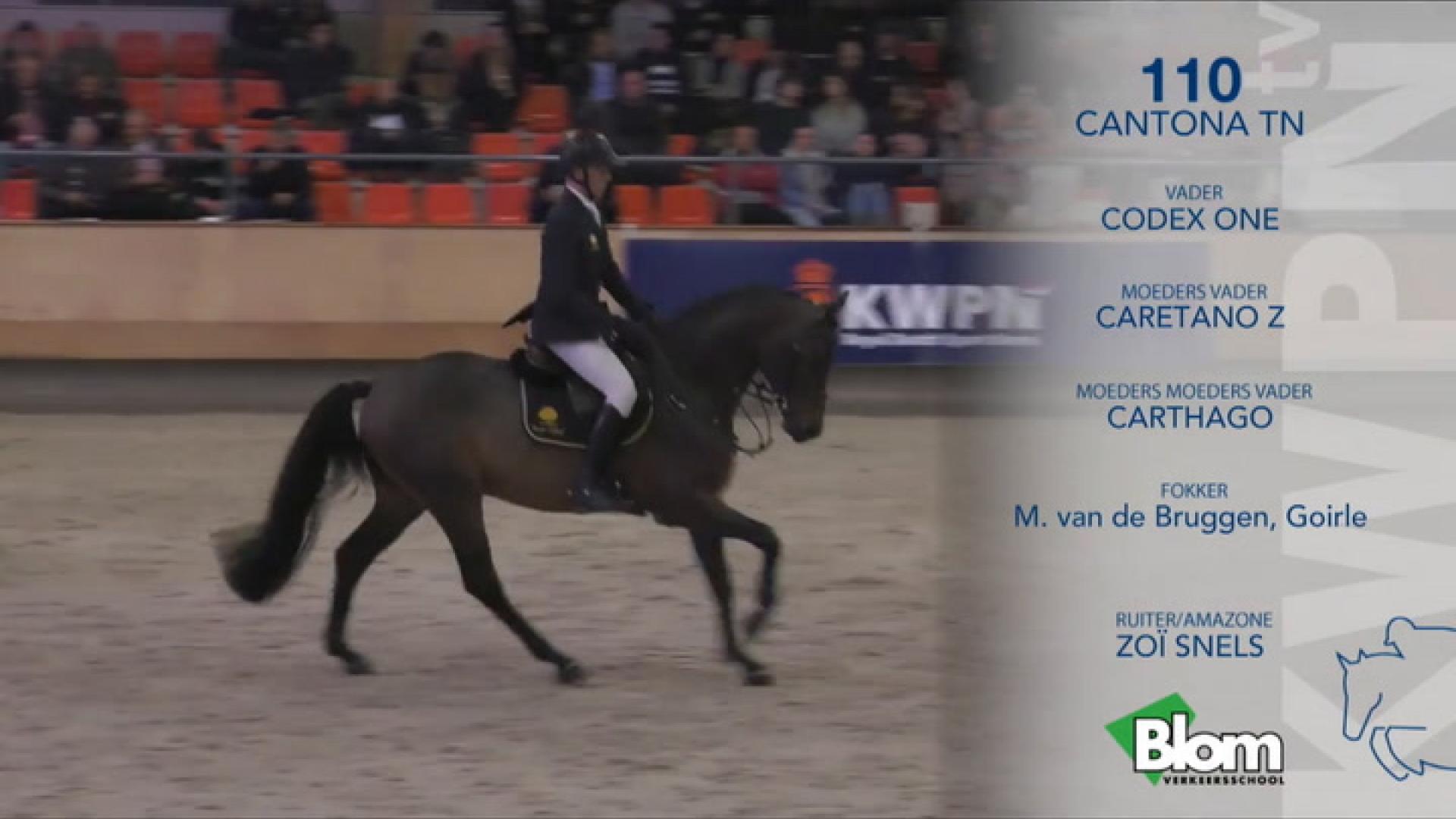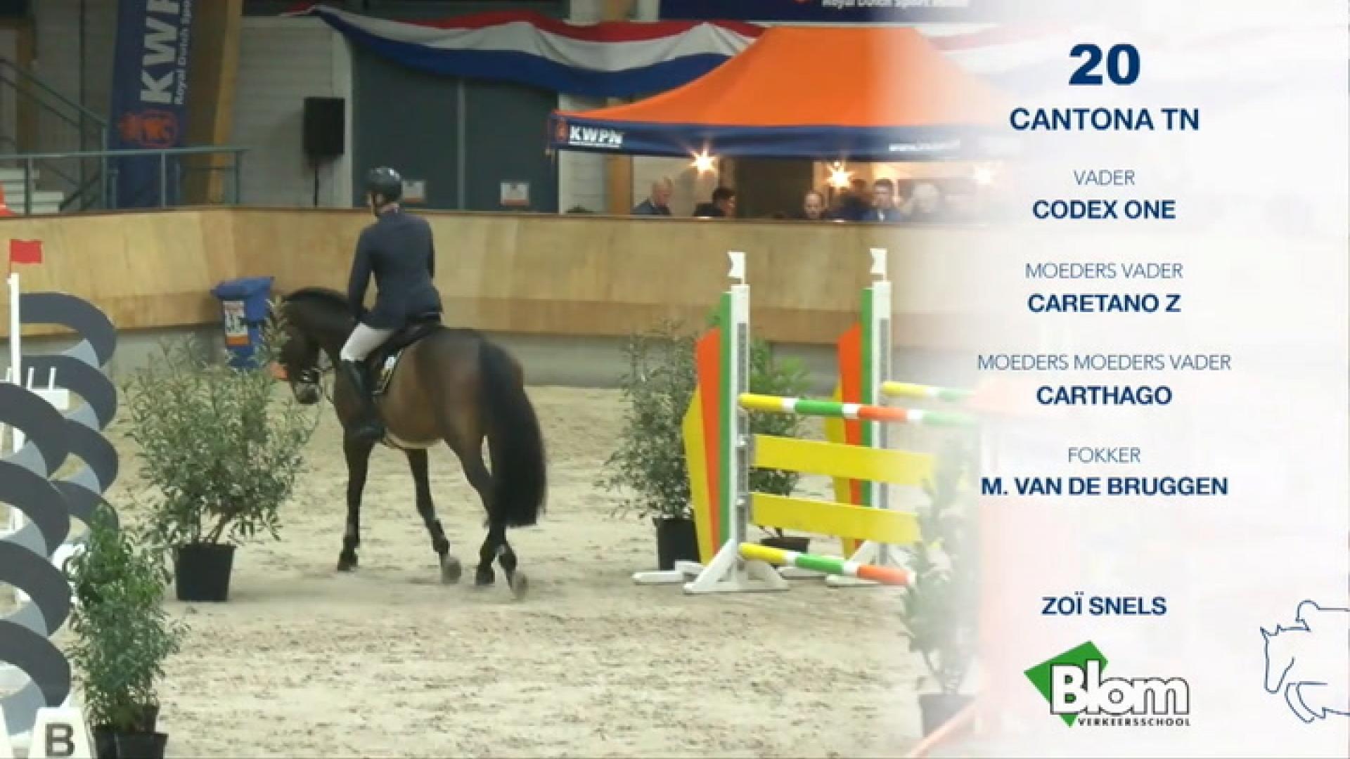 Cantona TN (Codex One x Caretano Z x Carthago)Cantona TN showed a uniform collection of well developed, attractive and long-lined foals that occasionally had a downhill body direction. The foals have an appealing head, a lot of expression and an appealing front with a slightly vertical neck that has goed muscling. The back is of good length, somethings a little sunken but with good connection tot he loins. Loins are of good muscling. The majority of the foals that were selected by the owner had a good topline. The frontleg is correct, as well as the hindleg. The legs are dry and sometimes delicate. The walk is correct and of sufficient scope. The trot is shown with a good technique in the legs, is of of abundant scope and shows a clear imprint and suppleness. The canter is powerfull, of good scope, supple and with good balance. The foals clearly upgrade in quality when shown in movement.