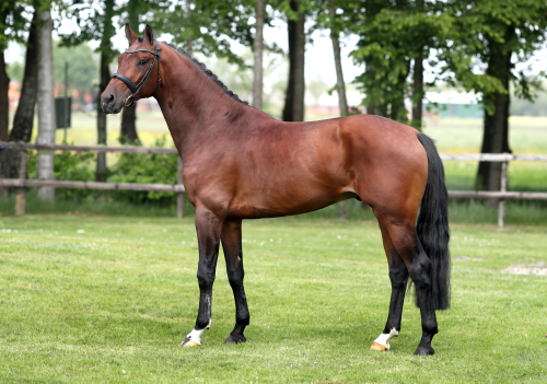 Conformation:Lloyd is a well-developed, appealing stallion with a good rectangular model. The head is appealing. The neck has more than sufficient length with a correct head-neck connection. The neck is slightly vertical, of good length and somewhat deep out of the chest. The shoulder has good length and a good position. The withers are well developed and of good length. The back is good in length and is well-muscled. The loins are well connected and well-muscled. The croup has a slight slope position, has good length and good muscling. The hamstring has more than sufficient length. The foreleg is slightly over at the knee and tied-in when viewed from the side and slightly toed-out when viewed from the front. The hindleg is slightly straight. The pasterns are good in length and correctly positioned. The foundation is well developed and of good quality. The hooves are well developed, good in shape and of good quality. The heels are correctly developed.