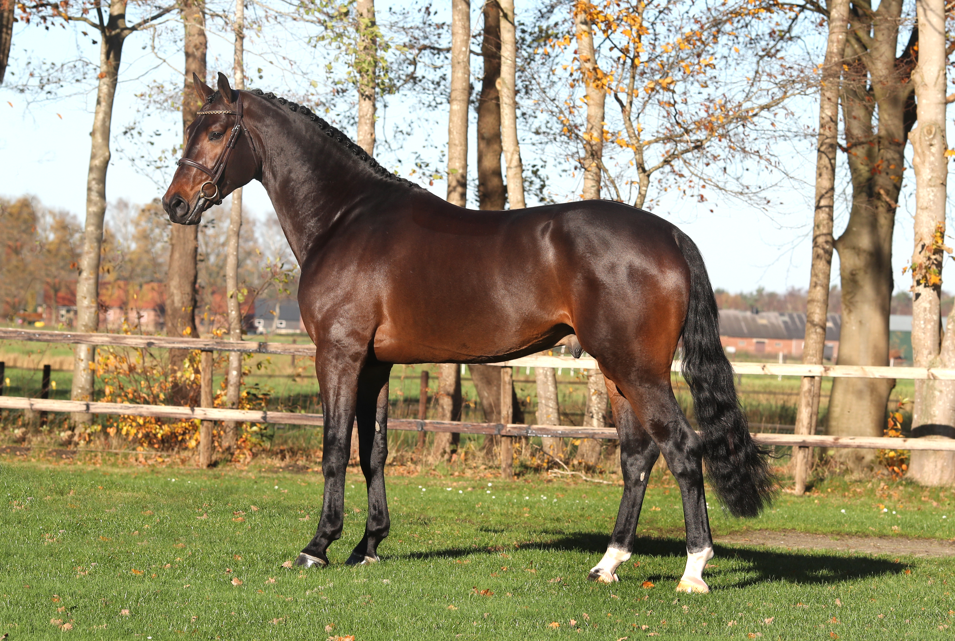 Monator vd Radstake is a royal-developed appealing stallion who is correctly standing in the rectangular model. The stallion has an appealing head. The neck is sufficient in length with a slightly heavy head-neck connection. The neck is vertically-positioned, good in length, and well-muscled. The shoulder is good in length and well-positioned. The whither is sufficiently-developed and more than sufficient in length. The back is good in length and well-muscled. The loins are well-muscled and well-connected. The croup is positioned sloping, more than sufficient in length, and well-muscled. The pant muscle is sufficient in length. The foreleg is correct. The hindleg is correct. The pasterns are good in length and correct. The foundation is well-developed and of good quality. The hooves are well-developed, slightly narrow, and of good quality. The heels are well-developed.