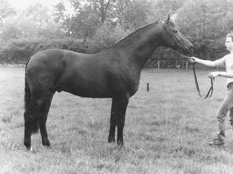 Offspring 1985 (foals)The foals by this stallion are remarkably well developed. The collection that was shown was very riding type. The collection was comprised of long lined foals with sufficient quality. The collection was very uniform. The head is lean, well formed and shows a great deal of expression. The long, well-formed and well-carried neck evolves into a long poll. The well-developed wither is long. The shoulder placement and development is good, with a rare exception, when the shoulder is bit straight. The well-muscled back sometimes is a bit long. The croup/loin/back connection is good. The croup is well formed and strongly muscled with a long hamstring. The foreleg is well positioned and has a well-developed knee. The hindleg also has a strong joint, is well formed but often a little long. In general the legs should have even more appeal, especially in the pastern. The walk has suppleness but should come a little more from the shoulder. The trot has a great deal of scope, suppleness and cadence but should be more powerful behind. Most of the mares with the foals were of good quality. All available foals were shown.