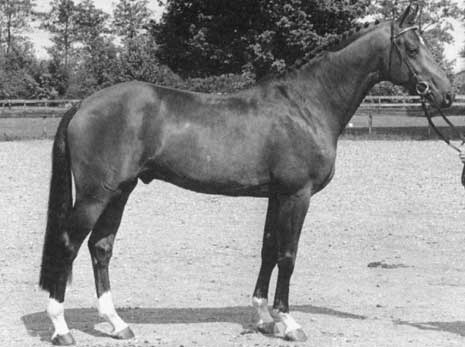 Offspring 1992 (foals)This Holsteiner stallion showed a uniform group of well-developed foals. They are long-lined. The picked foals were of sufficient riding type, the selected foals were of good riding type. Even though they are expressive, the heads are a little long. The neck is long, has good shape and is carried well. The withers are nice and long and sufficiently developed. The length of the shoulder is almost always good, but (especially among the picked foals) could have more slope. The back is usually long. The loin is good, even though some of the picked foals were a little hollow. The croup is wide and muscled but often could have a little more length. The foreleg is well placed and sufficiently developed. The hindleg is often long and somewhat angled. The foals walk well, easy and relaxed with good use of the back. The trot has good size, freedom of the shoulder and suppleness but the hindleg could develop more power. The stallion had good mares