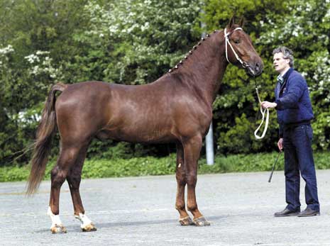 The head is expressive but there are a few foals with a bit of a roman nose. The poll is sufficient in shape and length. The neck has good length and position. In several cases it comes from deep in the chest. Frequently the transition from the wither to the neck could be smoother. The wither has sufficient length and is well developed. The shoulder has good length and position. Sometimes the back is hollow. The loins are well muscled but sometimes they are a little tight. The croup has sufficient position but is generally short. The hamstring is sufficient in length. The stance of the foreleg is correct but should generally be longer. The stance of the pastern is normal. The stance of the hindleg is normal. The base is sufficiently developed and shows quality. The shape of the hooves is normal.