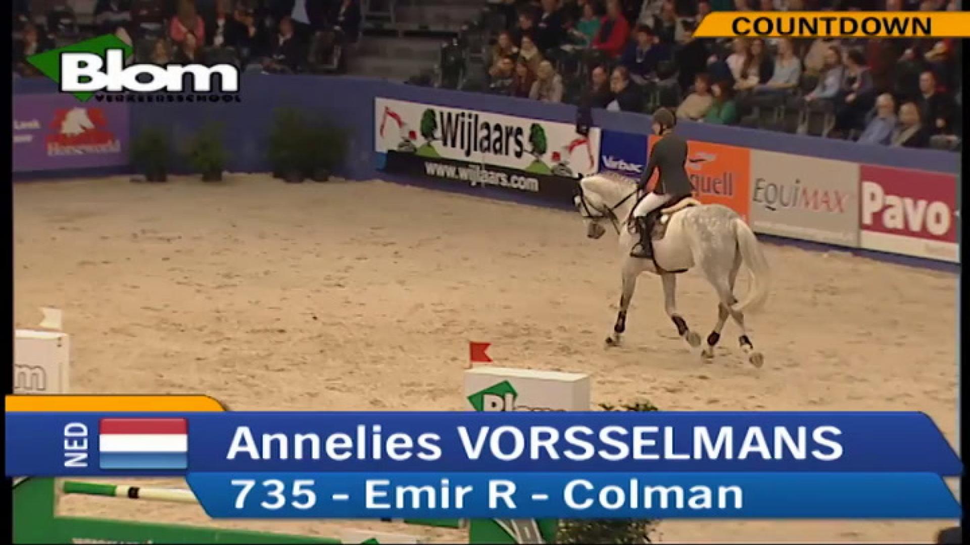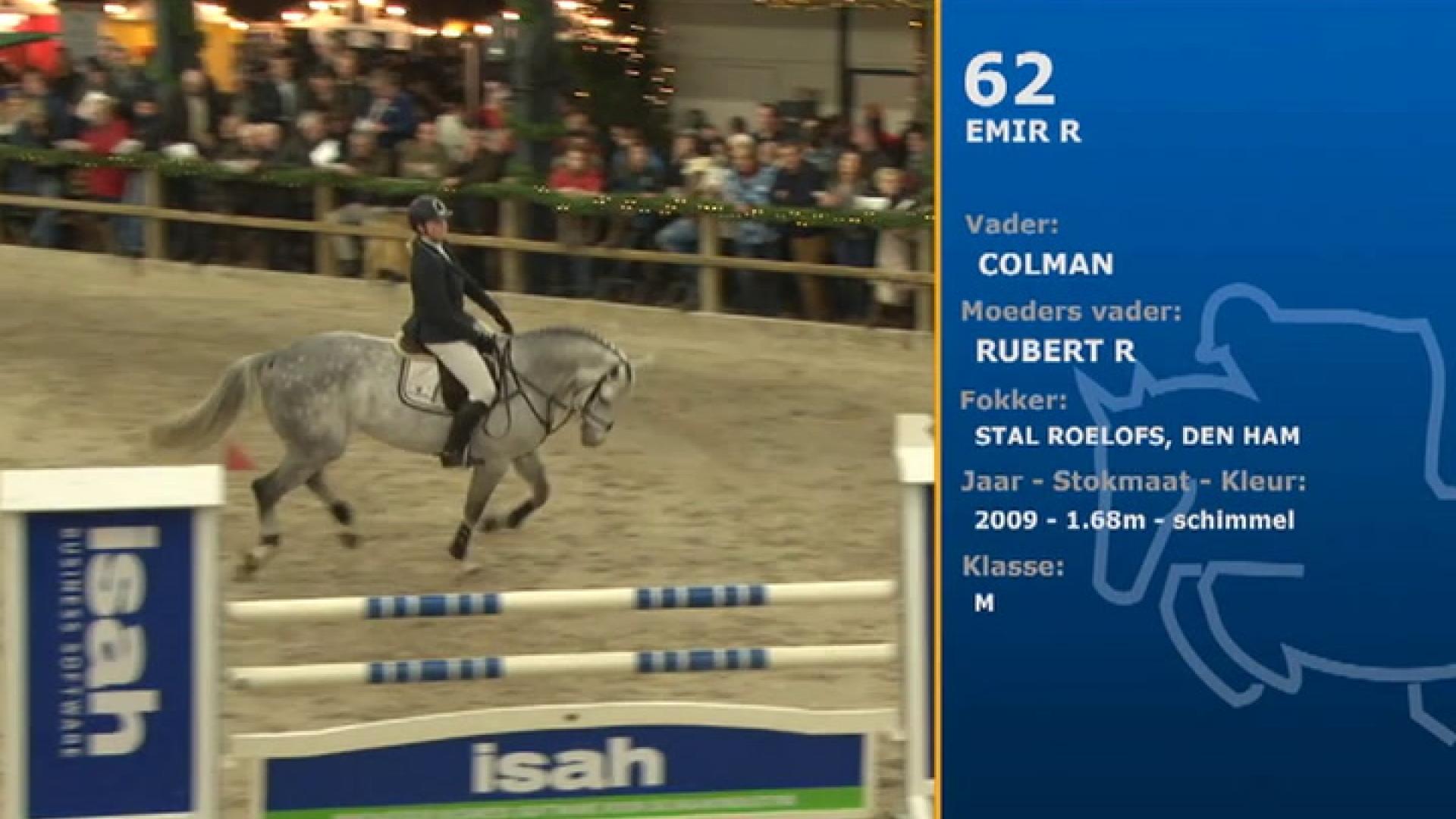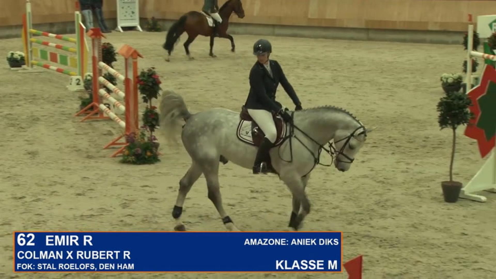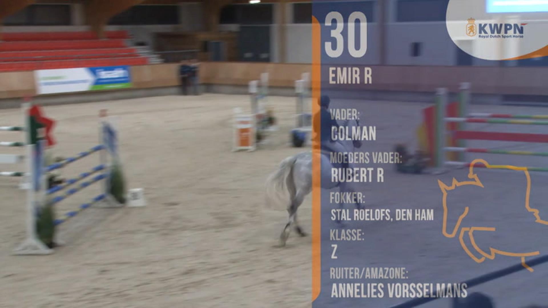 Emir R is by the Carthago son Colman out of the elite mare B.Termie R 23, a Rubert R (Mermus R x Joost) daughter who completed a very good mare test and won the Reserve Champion title in the older jumper mares division at the Central Inspection in Overijssel. Her dam T.Termie 21 is a provisional keur mare by Voltaire. Emir R's great-granddam Dwermie, a G.Ramiro Z daughter, boasts the preferent and prestatie predicates. Furthermore, Dwermie produced the KWPN stallions Mermus R and Odermus R as well as the international jumper Vanquish (s.Numero Uno) and the selected stallion Wender R (s.Contender). Emir R's dam-line continues with daughters by Joost, the English Thoroughbred Abgar xx, and Rigoletto. The KWPN stallion Tolan R is also a descendent of this dam-line.