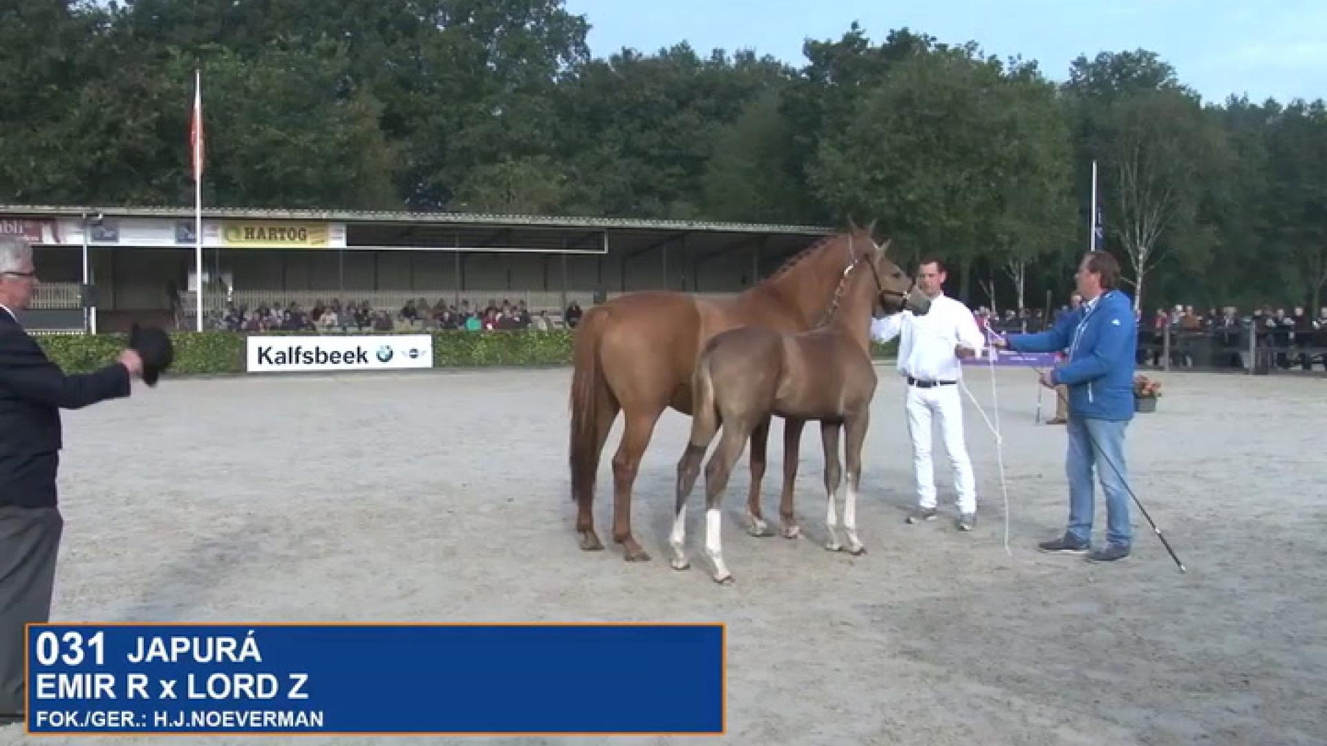 Emir R showed a uniform collection of foals with more than sufficient to good development, good rectangular-shaped conformation, and abundant presence. The legs are correct and solid, but repeatedly fine-boned. The walk has more than sufficient to good scope. The trot has more than sufficient scope and abundant elasticity. Twenty foals were evaluated at their home location and deemed to have a good canter; however, at the central offspring inspection, the Stallion Selection Committee noted that the foals selected by the stallion's registered party cantered with a high croup, which adversely affected their elasticity.