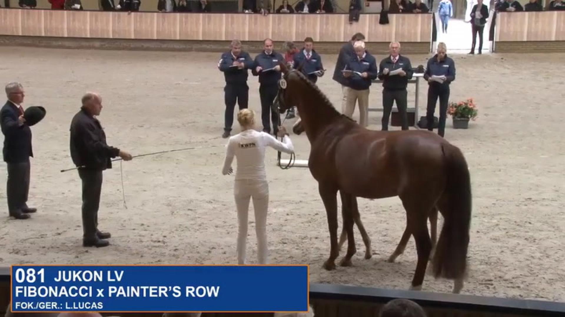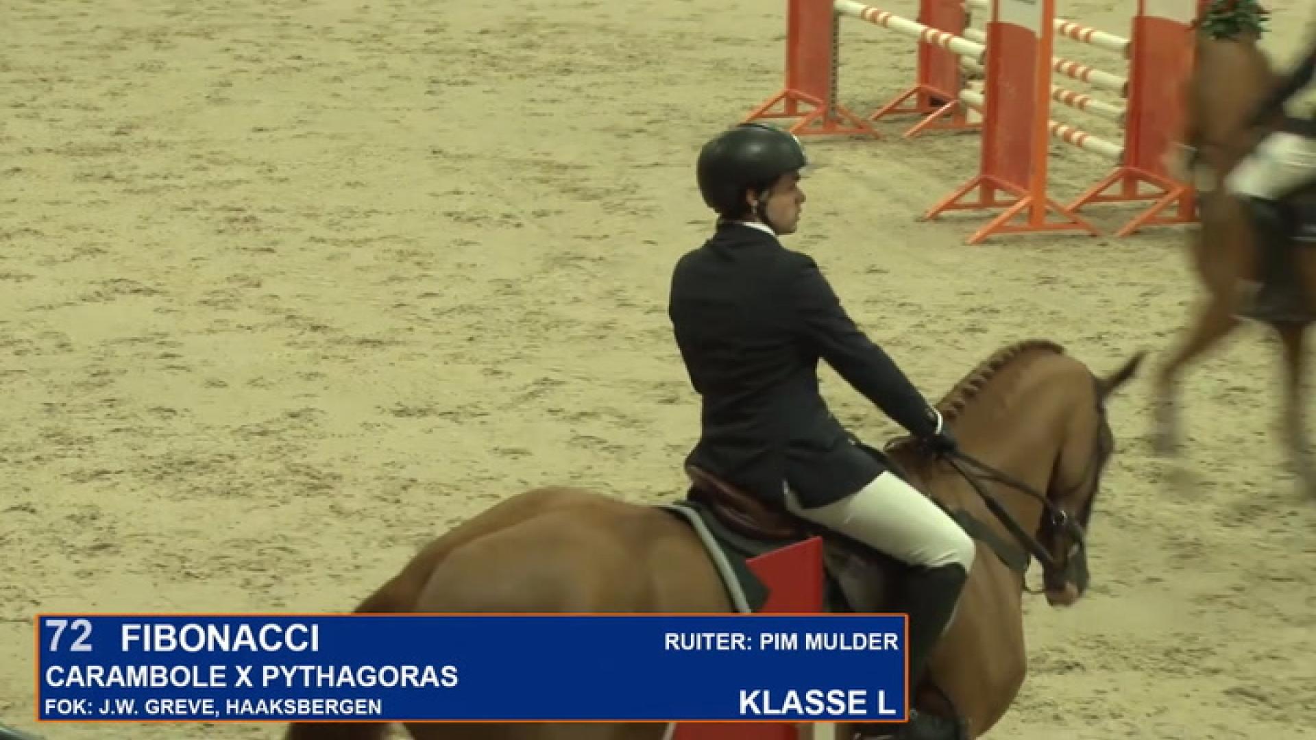 Fibonacci is a well-developed stallion with more than sufficient jumper conformation and sufficient presence. The head is sufficiently attractive. The poll has sufficient length but a slightly heavy head-neck connection. The neck has good length but comes out deep from the chest. The wither is more than sufficiently developed and has good length. The shoulder has more than sufficient length and placement. The back has more than sufficient length and good muscling. The loins are well connected and have good muscling. The croup is sloped and has more than sufficient length. There is good length from the point of the hip to the point of the buttock. The front legs are slightly toed-out. The hind legs are correct. The legs are well developed and of more than sufficient quality. The hooves are a fraction small but of good quality.