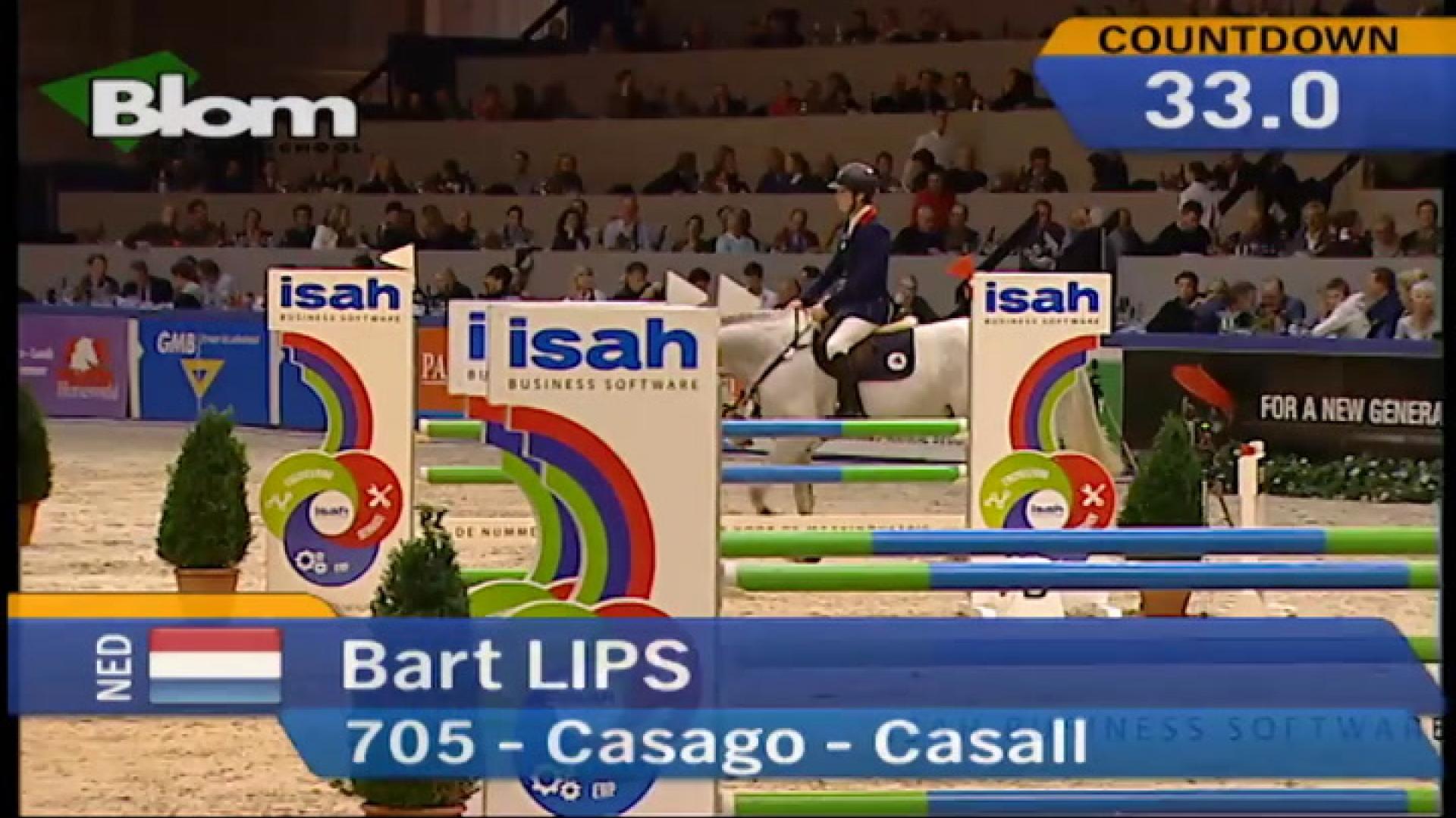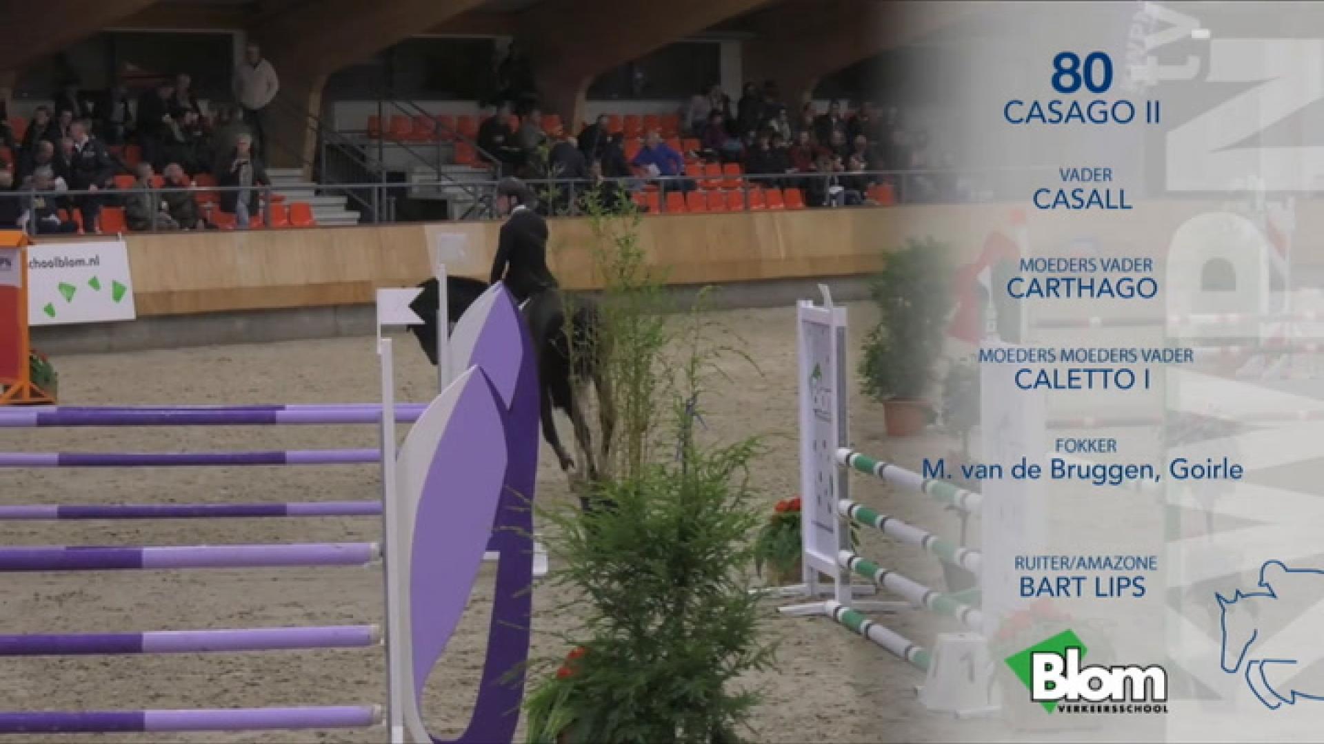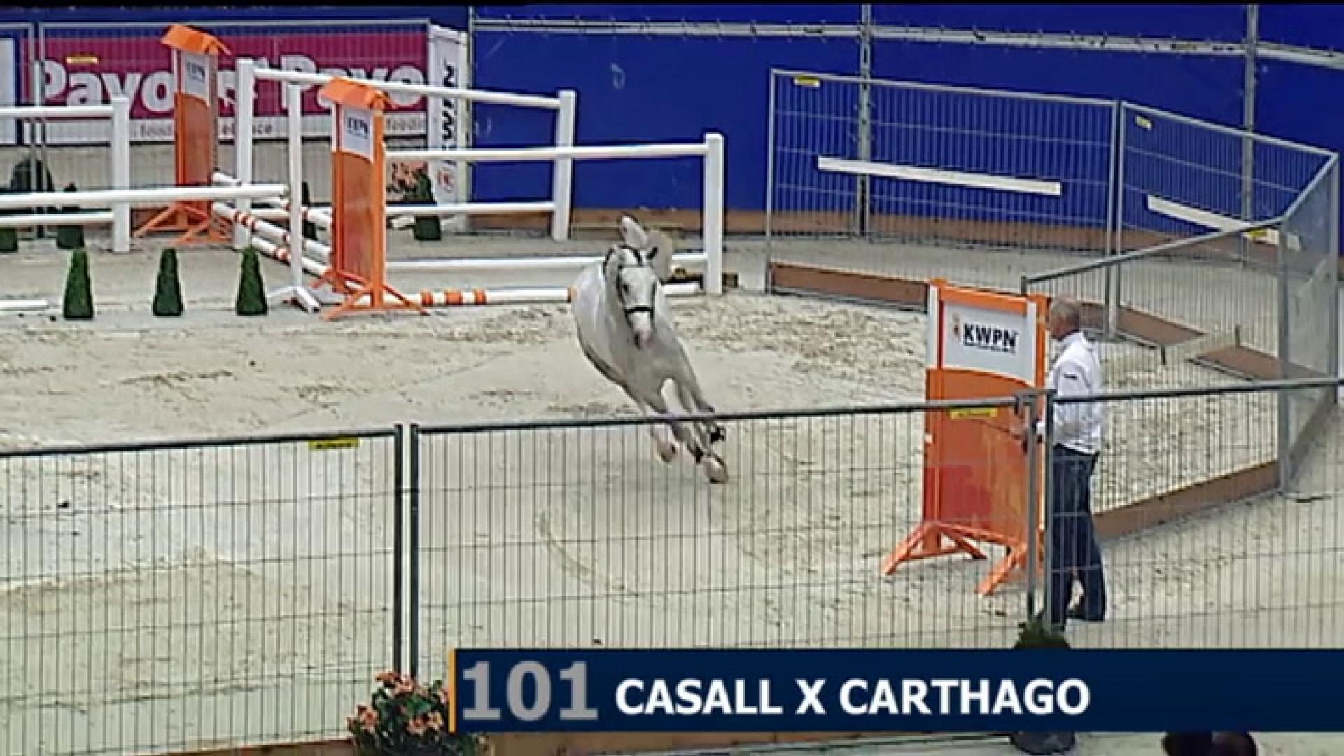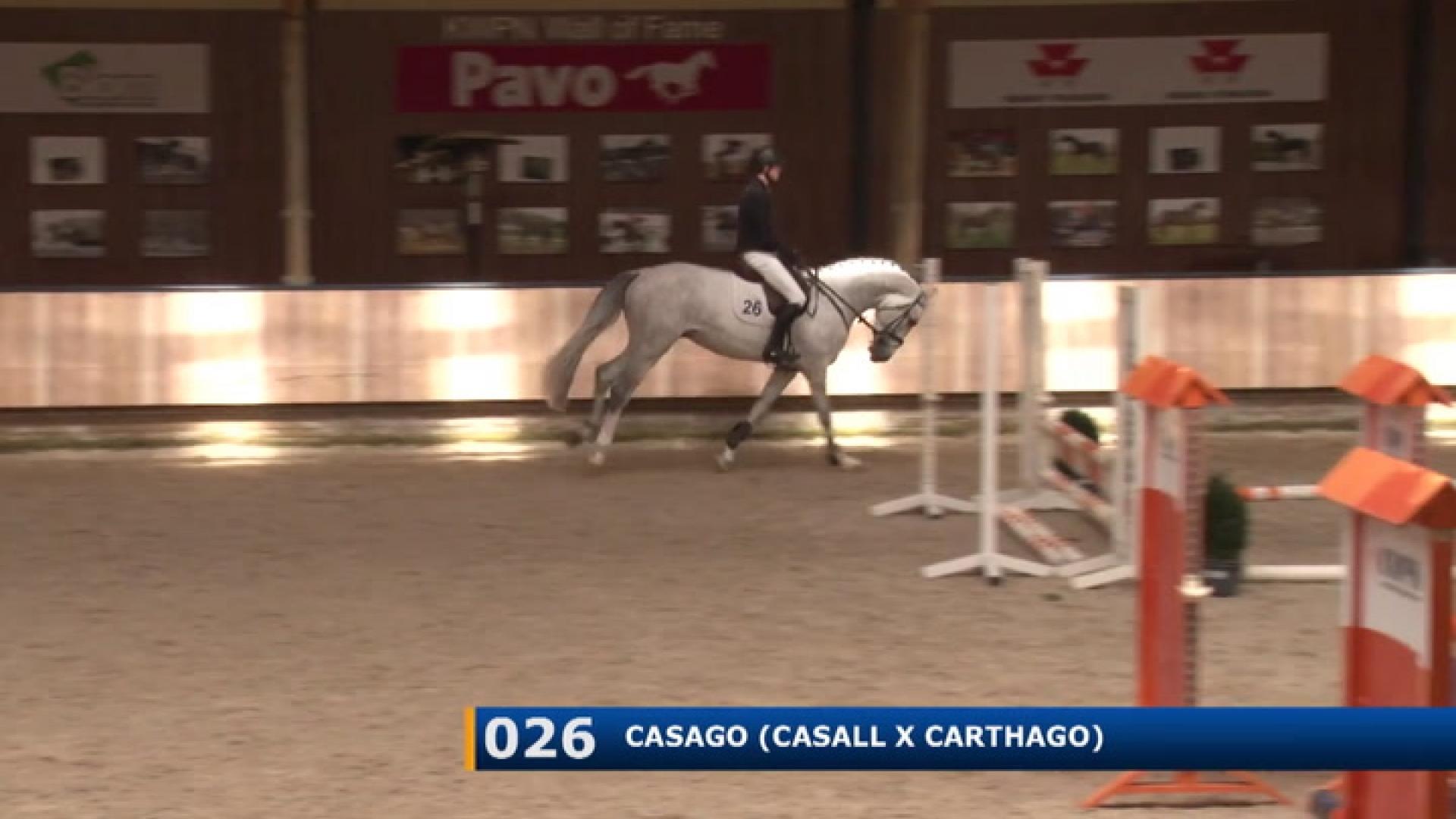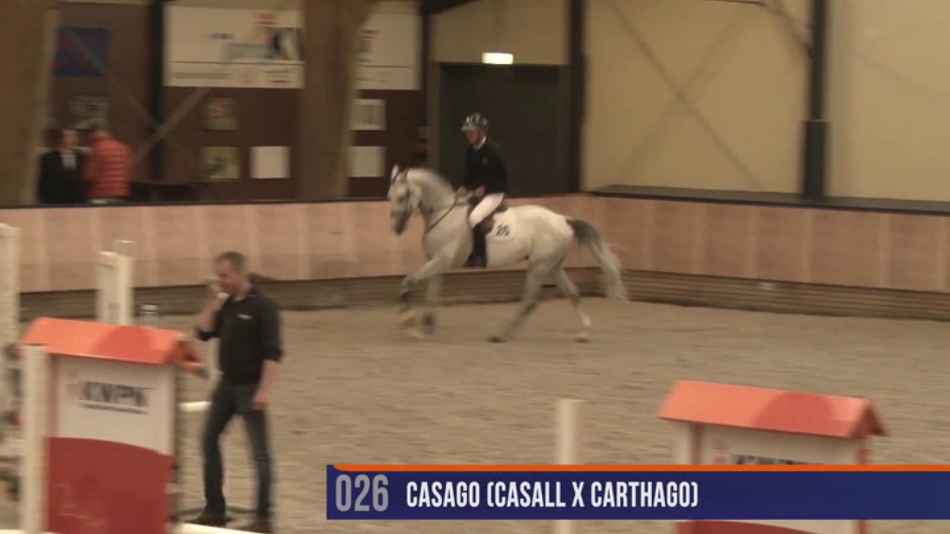 Casago is an honest and reliable stallion with a good temperament. He is very willing to work, has good to very good trainability, and a good mouth. The walk has more than sufficient scope. The trot has more than sufficient to good scope. The canter is light-footed, carried, and has more than sufficient to good scope and elasticity. The stallion moves with good body position and balance. Casago jumps with more than sufficient to good reflexes. The stallion jumps with good front leg form but uses his body somewhat inconsistently. He appears careful and shows more than sufficient to abundant scope. Casago demonstrates more than sufficient to abundant talent as a jumper and gives his rider a more than sufficient to good feeling.