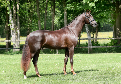 Kilimanjaro (Bordeaux x Westpoint x Don Schufro)Kilimanjaro showed a uniform collection, more than sufficiently developed foals that are appealing and long-legged. The foals are in a good rectangular model. The neck is usually good in length and shape and more than sufficiently muscled. The shoulder is well positioned. The back and loins are usually correct, sometimes slightly weak and usually more than sufficiently connected. The foreleg is correctly positioned and sometimes a bit straight. The hindleg is usually set correctly. The walk is sufficient to more than sufficient in space and should have more use of the body. The foals of Kilimanjaro trot remarkably light-footed with good space and flexibility. They canter with good space, a lot of flexibility and with a more than sufficient to good impulsion.
