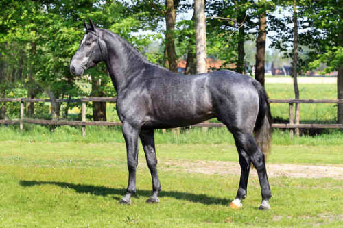 Conformation:Irvington VDL is a more than sufficiently developed stallion with more than sufficient rectangular-shaped conformation. The head is sufficiently attractive. The poll has sufficient length with a heavy head-neck connection. The neck has sufficient shape, more than sufficient muscling but needs more length. The wither has more than sufficient to good development and more than sufficient to good length. The shoulder has more than sufficient to good length and more than sufficient to good placement. The back has more than sufficient length and good muscling. The loins are more than sufficiently muscled and well connected. The croup has good placement, more than sufficient length, and good muscling. There is more than sufficient to good length from the point of the hip to the point of the buttock. The front leg is constricted when viewed from the side but correct when viewed from the front. The hind leg is correct. The pasterns have more than sufficient length and are correct. The legs are more than sufficiently developed and of sufficient quality. The hooves are somewhat narrow but well-developed and of sufficient quality. The heels are well developed.