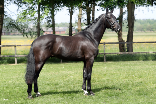 Conformation:Kardieno is a well-developed stallion with a good rectangular model and has a more than sufficient Gelders type. The head is more than sufficiently expressive. The head-neck connection is a bit heavy. The neck has good length and should be slightly more on top of the body. The neck comes out deep out of the chest. The shoulder has good length and more than sufficient position. The withers are well developed and of good length. The back is good in shape and length and the loins are well connected. The croup is sloping and of good length. The position of the foreleg is correct. The hindleg is long and sickled. The pasterns have good length and stance. The hooves are well developed. The foundation is hard and well developed.
