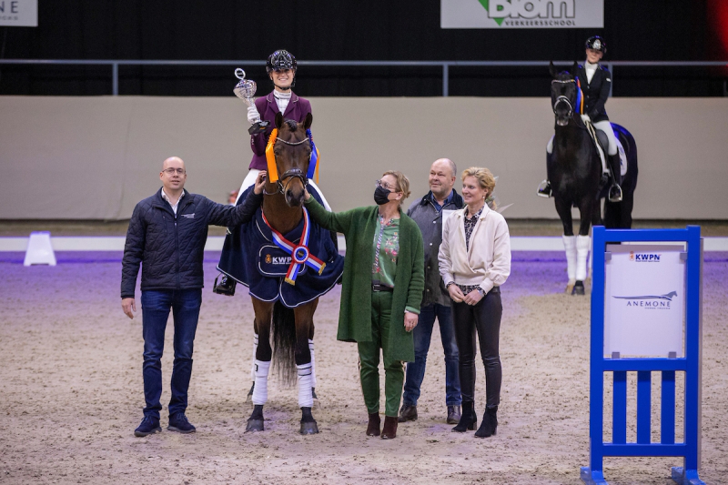 Bart Bax, Mariette Sanders and Monique Peutz judged the Anemone Horse Trucks Stallion Competition Dressage final. The jury could award the highest marks to McLaren (Morricone out of Samantha by Sir Donnerhall, bred by U. Toenjes of Ganderkesee). The alluring stallion already won the selection competitions in Kronenberg, Ermelo and Exloo and was well in the lead. In the final he showed a very consistent performance. He is a beautiful, elegant appearance. Dinja presented him in a lovely manner. It is such a charming stallion with so much potential for the future.”