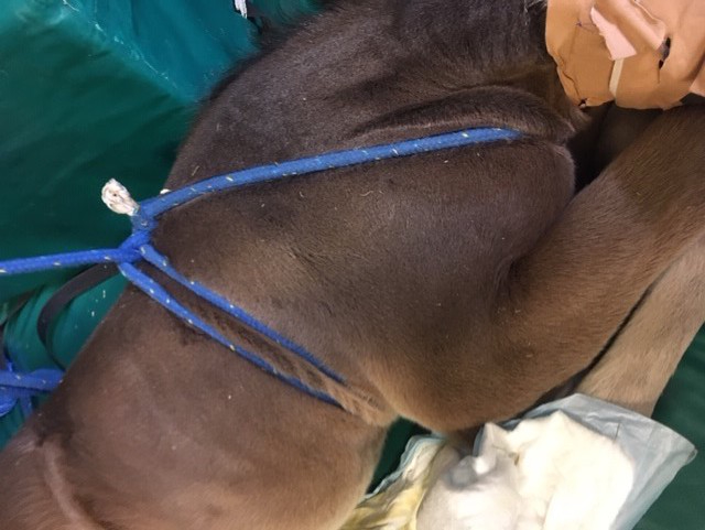 In case of the second cause, rebirth may work well. Esther explains: “During the pregnancy, foals are kept in a sleeping state by a certain hormone. This prevents them from moving too much around the womb and causing harm to the mare. During normal parturition, the hormonal composition changes – probably because of the pressure of passing through the pelvic canal – which wakes up the foal, so it will stand up and try to drink. In case of a quick birth or Cesarean section there may have been too little pressure and the change in hormones may be absent, as a result the foal may remain in a quiescent state. The past few years, the phenomenon rebirth and foal squeezing has been researched and found beneficial in these cases. It is a special technique using a simple rope harnass to mimick the pressure experienced during normal parturition. It is not effective in all foals, but for some it works very well. The foal appears to fall asleep, as if it’s in the mare again. Then it wakes up and the pressure is released. If all goes well, the foal will stand up to nurse. It has a good chance of growing up normally and healthy.”