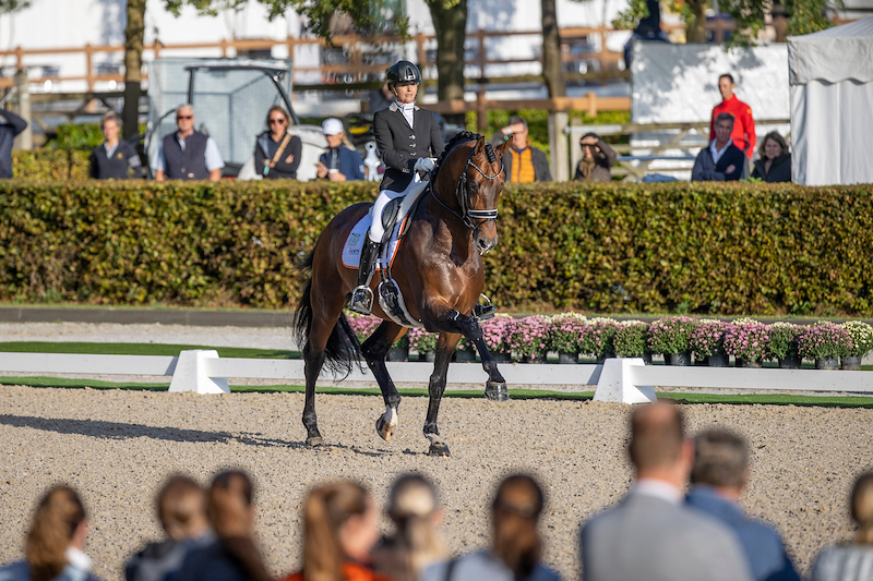 Kirsten Brouwer had a stroke of bad luck as it started pouring right before her test aboard Lightning Star (Ferguson out of Daily Enjoy elite pref IBOP-dres sport-dres PROK by De Niro, breeder Titan Wilaras of Riel). The umbrellas were clearly a distraction to the sharp mare, but Brouwers skillfully guided her to a good result. The trot was rewarded with an 8.8 , the perspective received an 8.5 and the total score of 82.8% secured them an eleventh position, and therefore a place in the final.