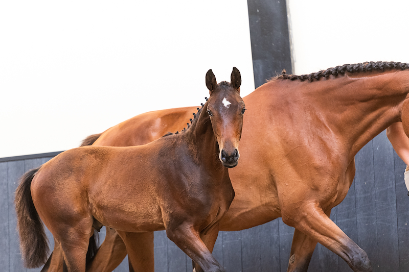 Performance genes are also ubiquitous in the jumper foal collection. One example is the colt Six On Vinio MB (Nixon van ‘t Meulenhof x Indoctro), whose granddam is a full sister of the WEG showjumper Havinia (s.Grosso Z) and his dam already foaled two young international 1.35m/1.40m show jumper. The Ermitage Kalone-offspring Somebody Stop Me SSS (s.Carera VDL) is bred out of a half-sister of Blom Cup winner Keep it Cool SSS (s.Zirocco Blue VDL) of Michael Greeve. The colt Scott Little H (Chopano Z x Indiaan) also originates from a solid performance lineage, in the maternal line he directly traces back to a full sister of the valuable Grand Prix sport and breeding stallion Tinka’s Boy (s.Zuidpool).