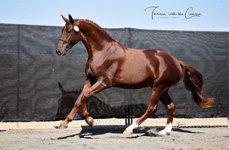 In the dressage yearlings, the North American Champion title went to the Koning DG- son Rockefeller HF (out of Valeska DG elite sport-dres pref by Krack C, breeder Ingrid Hamar of Visalia, CA, USA). “Very well developed and long lined foal with a good front. The head is a little long. Good shape of the croup and a strong and well developed foundation. He has a good walk with a lot of activity and a clear rhythm. The trot is light-footed, elegant and with good leg technique. The canter has a lot of balance and covers the ground with power and expression.” The reserve title went to Rhea DG (Koning DG out of Julea KS ster D-OC by Charmeur, breeder DG Bar Breeders, Inc. of Hanford, CA, USA). “A beautiful appearance, she has the development she should have. Well formed forehand with long shoulders and good topline. The hind legs are a bit straight. Her walk is smooth with good ground coverage. The trot is very light-footed, with good transitions and freedom of the shoulder. The canter is smooth, but could have a little more power.”