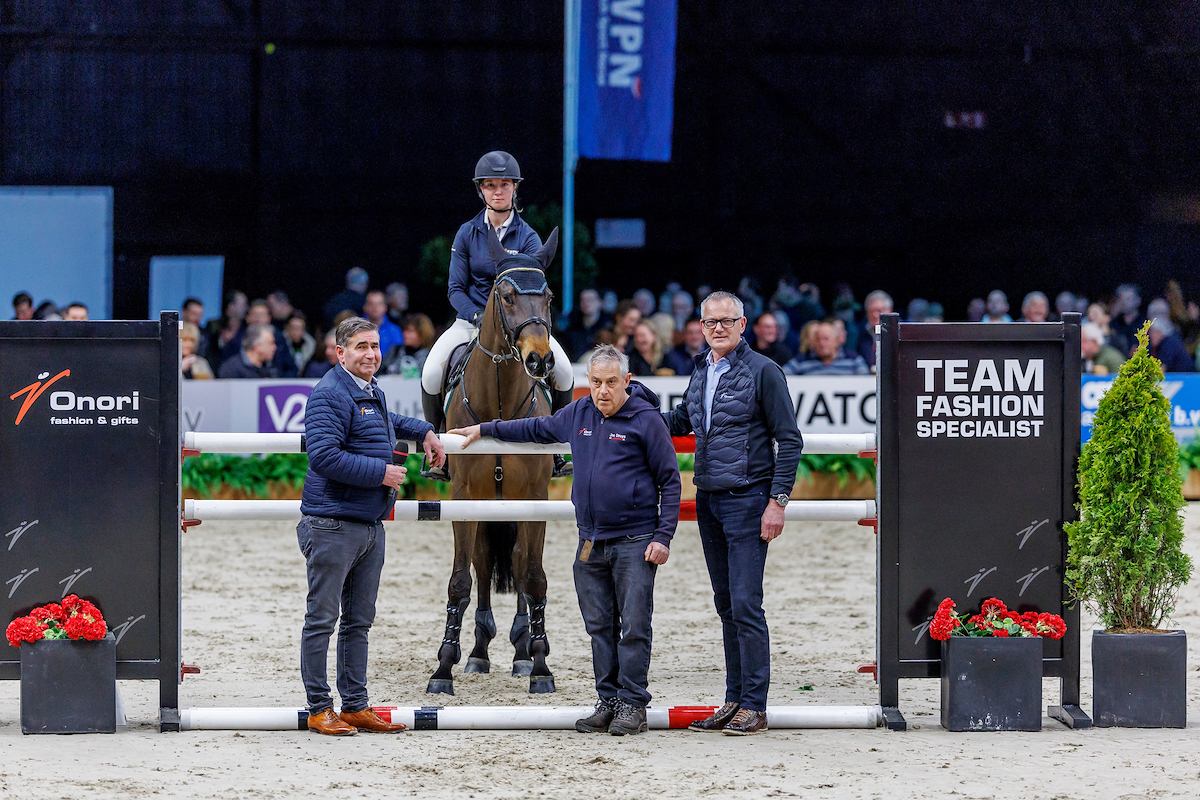 Henk: "Nelson has been successful on several occasions and performed very well in the Stal Hendrix Competition, among others. After the summer, he had a rest period; after all, he must continue to enjoy his work. We have slowly built him up again. This is a horse with natural balance and an easy canter. In jumping, he is an attentive horse, and that's something we teach them: to think for themselves. He doesn't jump too high, but very easily and without effort over the obstacles. Renee, relax your hand and let him turn nicely around your inside leg. Try to get him a bit more on the hindquarters. He maintains a constant canter rhythm and can easily shift. This is an initiative by Onori, so let's make that obstacle a bit higher. The first time he lightly touched it, but the second time you can see he learned from it and jumped perfectly over it. This is, of course, quite an environment for a young horse, but he just keeps doing his job. We have high expectations for this horse." In any case, he fits very well into the theme of this clinic: from young talent to medals at a championship!