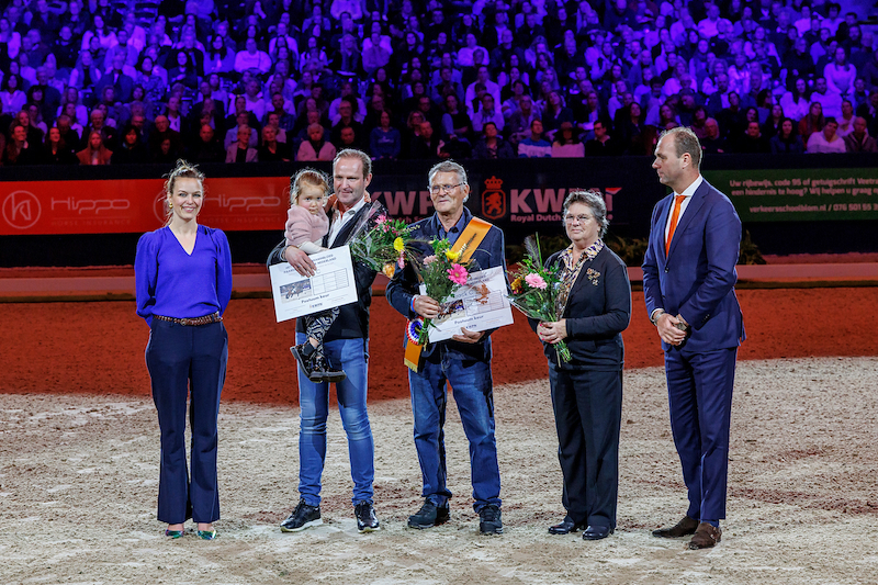 A week after his splendid victory in the Grand Prix at Jumping Amsterdam, it was announced that Everdale (by Lord Leatherdale out of Aliska K. Elite EPTM (dr) PROK by Negro Preferent) has been declared "Keur." The fifteen-year-old Everdale was not present in Den Bosch on Friday, but his rider Lottie Fry, accompanied by Anne and Gert Jan van Olst, represented him and was adorned with the orange sash. Everdale was bred by the Kluytmans family from Tilburg. Several of his offspring are successful in the Grand Prix, and he has three approved sons: Inclusive, Inverness, and Inspire. The sporting achievements of Everdale, including a bronze team medal at the Olympic Games in Tokyo, and his offspring's exceptional performances in sport were reasons for the Stallion Approval Committee to award Everdale the "Keur" predicate.
