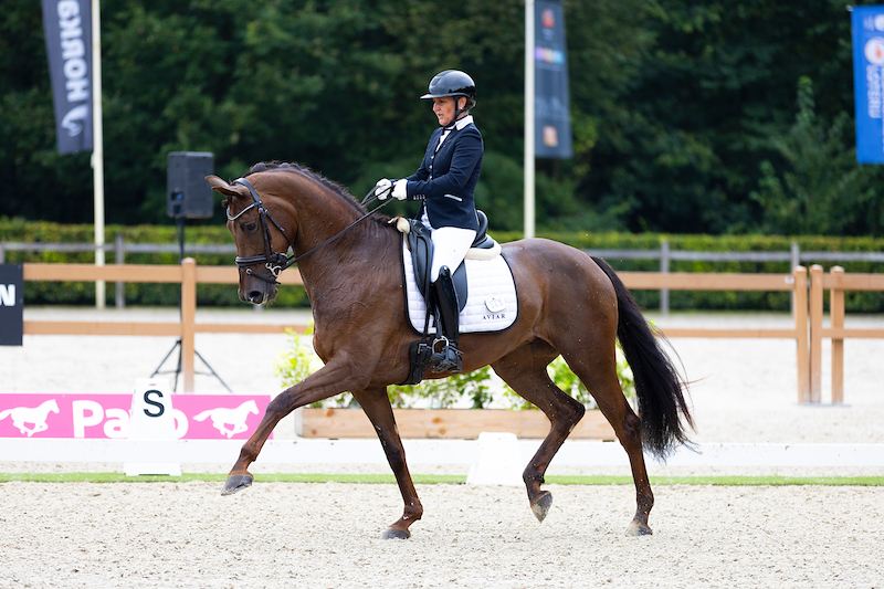 Bred from the full sister of Valegro, Ilegro (Inclusive out of Jalegrofleur ster pref PROK by Negro, bred by Van Olst Horses from Den Hout and Joop Hanse from Burgh-Haamstede) has the right genes for future Olympic Games. Under Zandra Birkeland, he scored 85.4 points, placing second in this semifinal. “This horse was beautifully presented, with the trot as a highlight. He has tremendous power, and when he stays engaged over the topline, the picture is truly beautiful.”