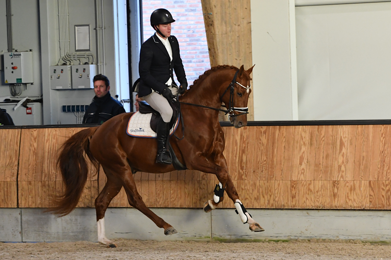 This morning, the three-year-old Gelderlander stallion Royal King (King Karim out of the Grand Prix dressage mare Zeronica, elite sport-dressage PROK by Talos) from breeder A.V. Noorman from Zuidwolde was presented under his own rider and subsequently underwent a veterinary inspection. “Royal King made a few jumps under saddle and showcased himself in dressage. After that, he was vetted, and once everything was approved, he moved in,” says inspector Luuk Smetsers on behalf of the stallion selection committee. Exactly one week from now, on November 11, the dressage and jumper stallions are expected for the performance test. “Each time, Royal King will be assessed immediately after the dressage horses. The dates for the interim assessments are November 12, 19, and 26. The final presentation will take place on November 30.”