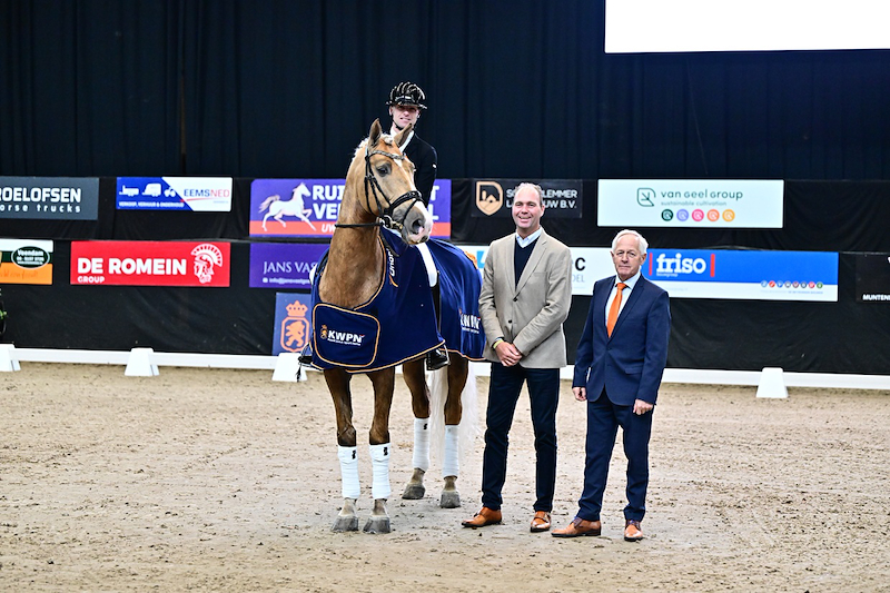 Three participants competed in the dressage test. The palomino-colored Odin (Edmundo out of Buonaternel, elite, IBOP, sport-dressage, pref, PROK by Vitens, breeders M.H. Zwaneveld and P.E.M. Herweijger from Assen), ridden by Dirk-Jan van de Water, achieved the highest score of 83 points. Jury member Janine van Twist commented: “In the first group, we saw two willing stallions, Odin and Ojee-B, each with their own charisma. Odin has a spacious walk, although he could show more looseness at times. In trot, we see a lot of quality and excellent foreleg use. His canter is large, expressive, and of high quality, earning him an 8.3, though he could show slightly more carrying power. For both harmony and overall impression, Odin deserved an 8.5 today.” The Ibsen B son Ojee-B (out of Jorien Tilde, elite, IBOP, PROK by Rubus, breeder G.S.W. te Bokkel from Eerbeek) took second place under Anouk Slabbers with 82.4 points. “Ojee-B follows the hand well in walk, although he could develop slightly more reach. His trot is rhythmic and supple, though it could show more extension. His canter is rhythmic, balanced, and supple, earning him an 8.5, as well as for harmony.” The very well-walking Olaf Official (Henkie out of Diamant, ster by Sirius, breeder G.J.W. Roerdinkholder from Winterswijk Kotten) followed in third place under Zoë Kuintjes with exactly 80 points. “The highlight of his test was his walk, for which we awarded him an 8.8. He walks beautifully through his body, his trot is rhythmic but could develop more balance, and his canter shows good suppleness.”