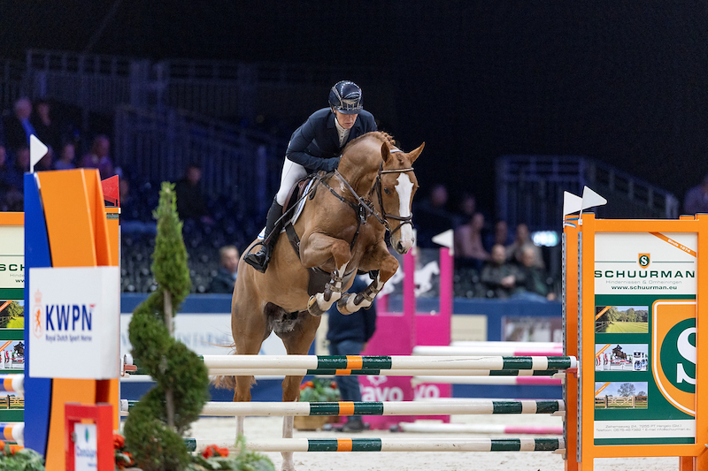 The four-year-old Royal-Star M (Poker de Mariposa TN out of Hannie ster by Tangelo van de Zuuthoeve, bred by G.B.M. Berendsen from Etten) and owned by M.J.W. ten Have from Ulft received his invitation for the performance test through this route. He jumped two small courses, just as he did in Ermelo. "The atmosphere here is a bit more impressive than during the first round viewing. Royal-Star M still appears somewhat green, but since he can immediately participate in the spring performance test, we are happy to give him this opportunity. He has a light-footed canter, is easy to ride, and shows a somewhat inconsistent front-leg technique." His grandmother, Silverdance, has already produced two 1.60m showjumpers: Chambery (by Berlin) ridden by Roland Englbrecht and Fearless (by Tangelo van de Zuuthoeve) ridden by Abdulrahman Alrajhi.