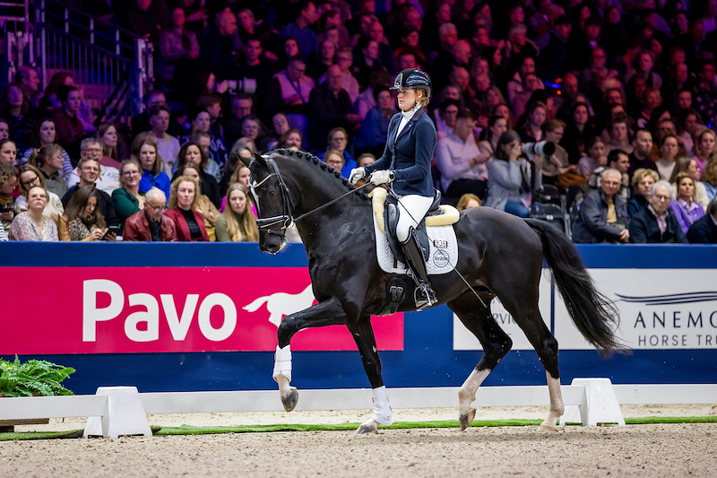 The stallions entered the arena in pairs, with a switch after each round to ensure they were not left alone in the impressive ring. First up was the grey Ridgedale (Glamourdale out of Zakiyah KEUR, PREF, PREST by Jazz, breeder D.M.L. Stoop-Collombon) ridden by Zandra Birkeland, owner Van Olst Horses. The stallion was slightly tense in the surroundings but consistently moved with good technique. Secret-son Secret USB from J.M. van Uytert and Stal Brouwer (bred from Soiree Noir by Spörken, breeder Gaus) was presented by Alvaro Rodriguez Siscar and demonstrated great suppleness and looseness in his body. The stallion could already easily switch gaits.
